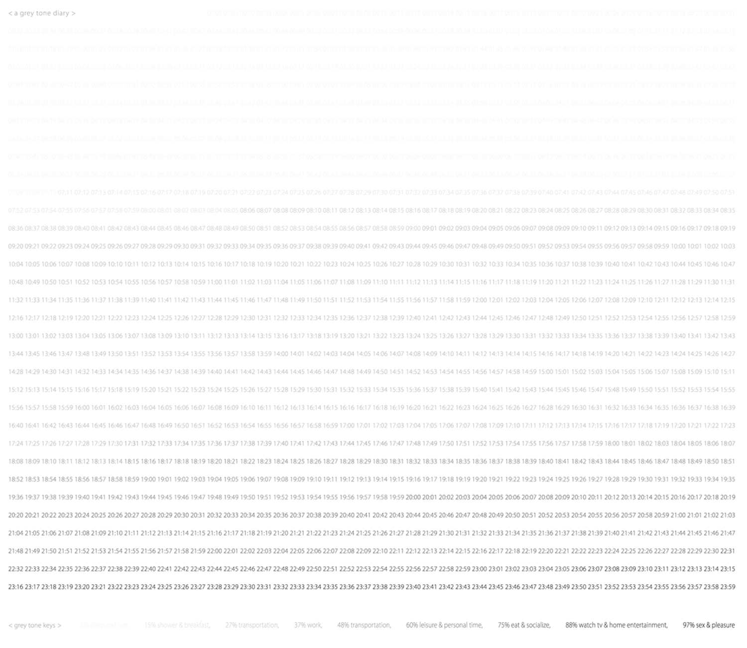 This composition is made to participate in the GAP magazine issue no 4, under the Biopolitics title. A whole day is represented in seconds.An overview of a modern man’s average activities is presented, each of the day’s second is colored with different percentage of black: 5% is used for representing the seconds used for the sleeping activity and it gradually gets darker, until pleasure time is represented with 97% black, yet with the minimum duration.