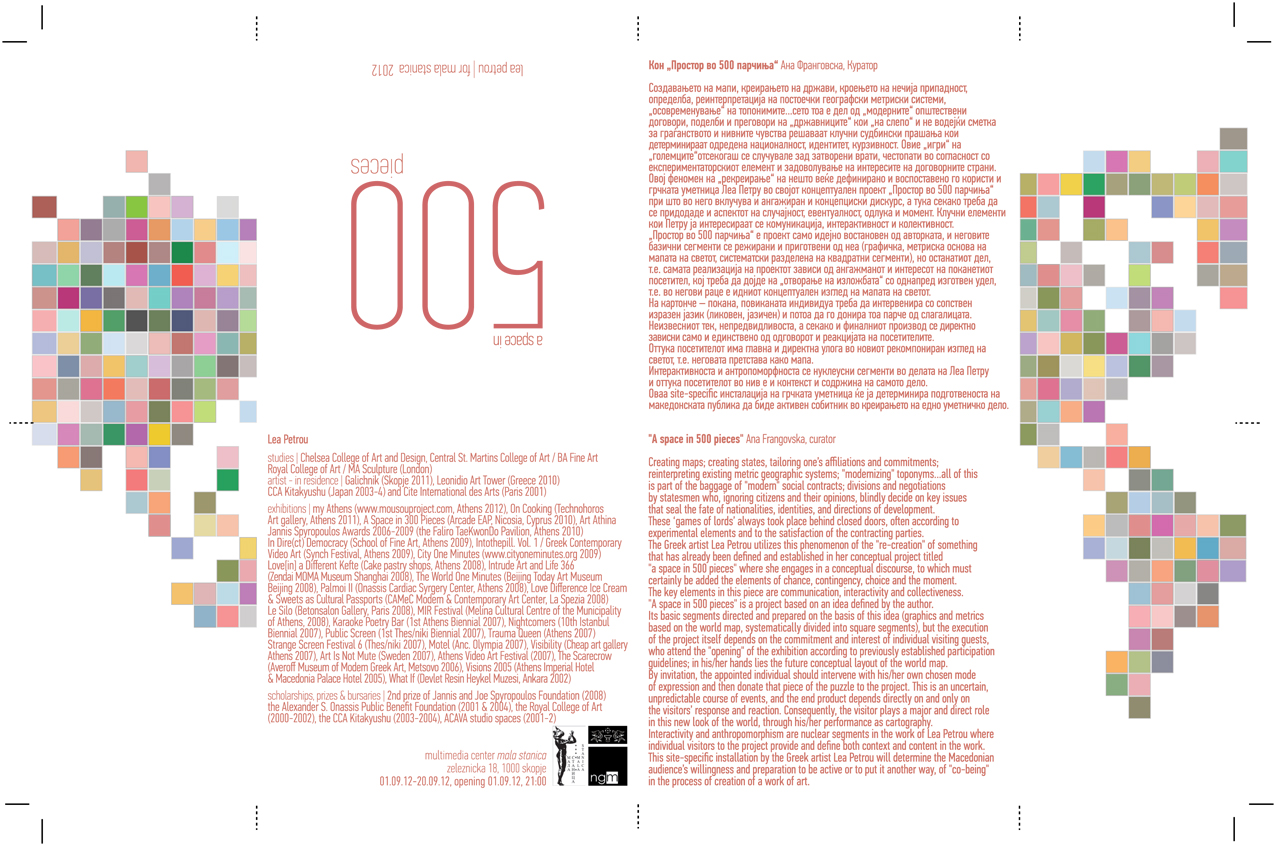 Front + back view of the pocket-size catalogue of the solo exhibition A Space in 500 Pieces, Skopje, 2012.